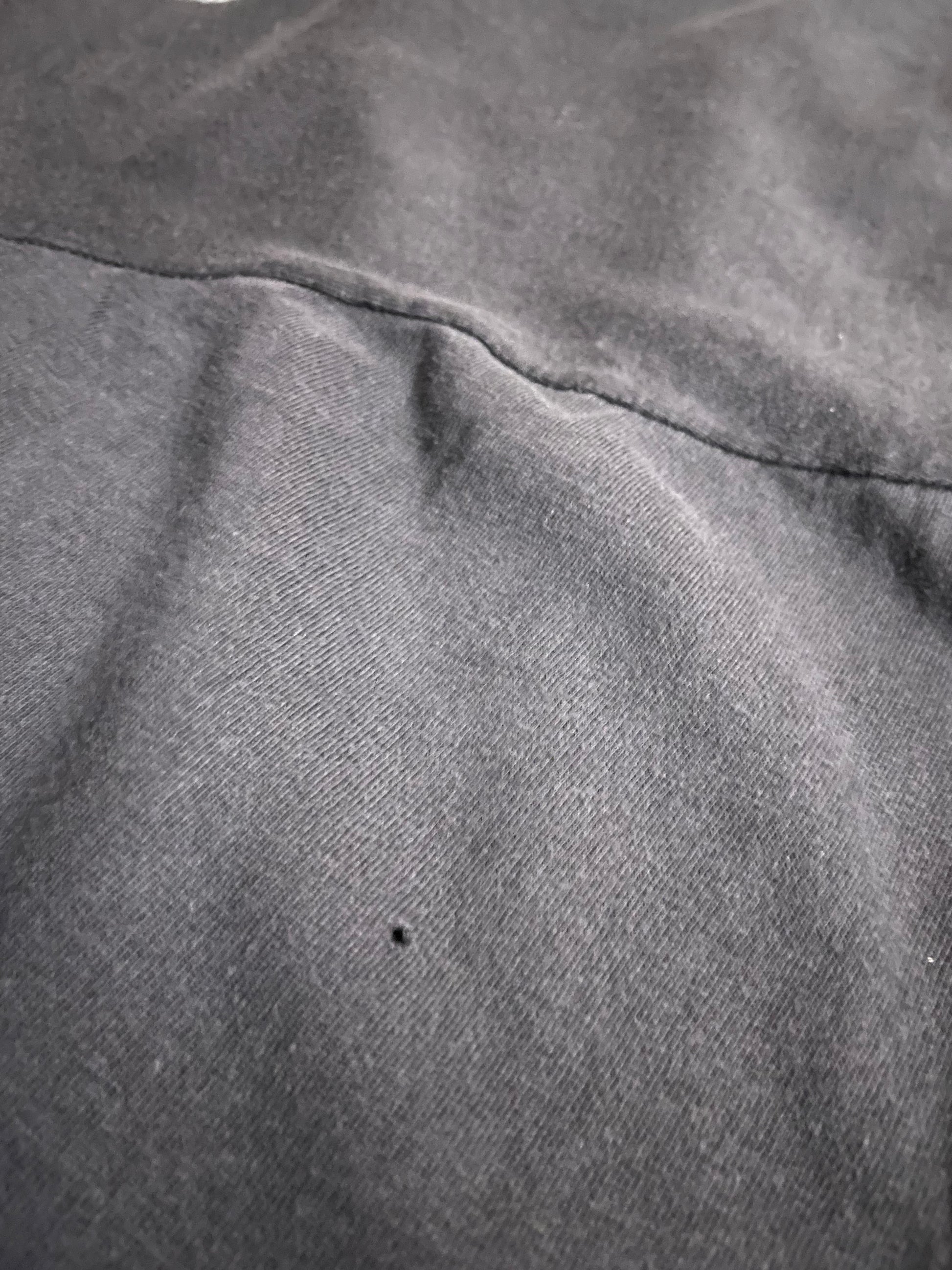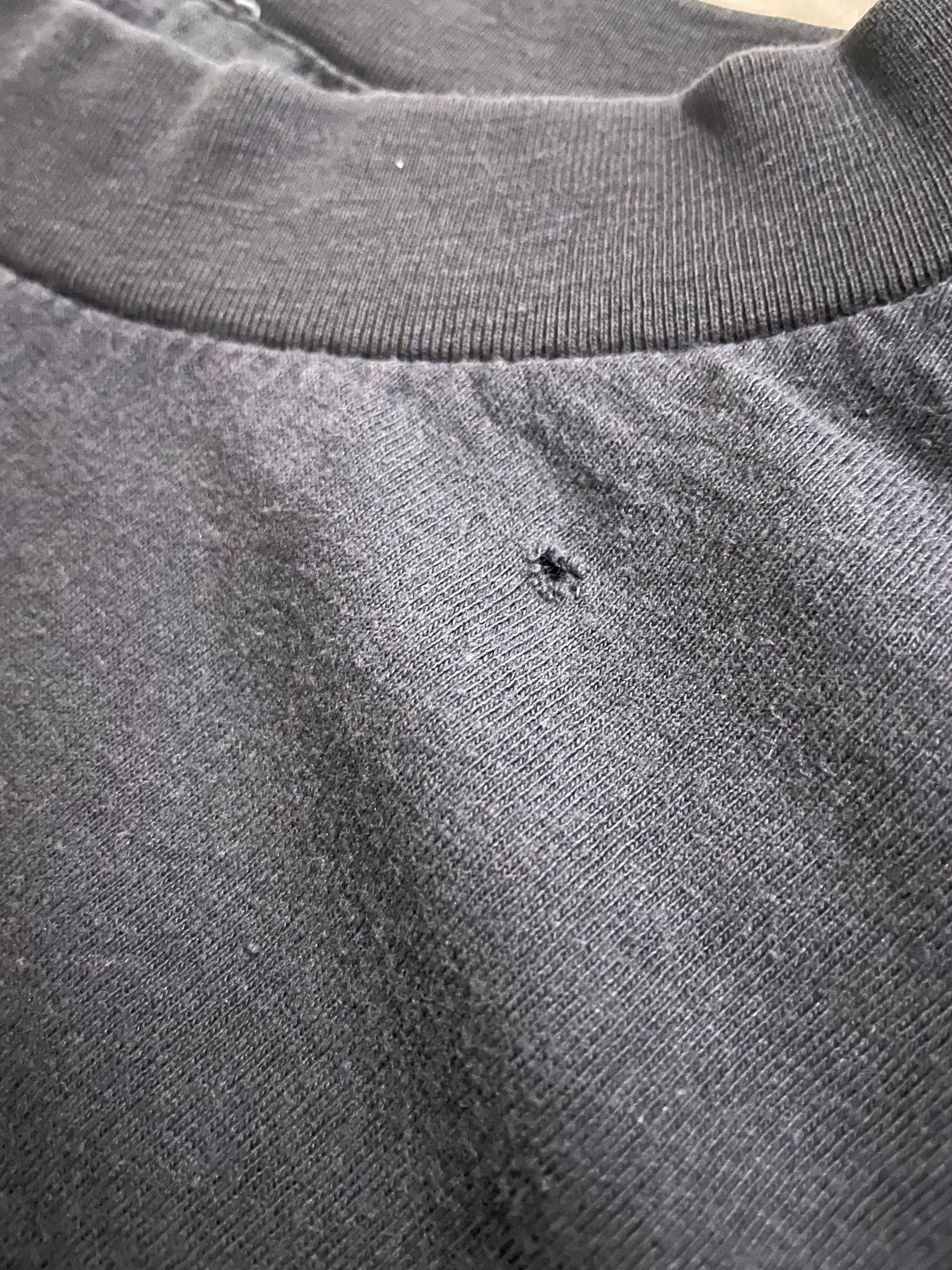 In a used vintage condition. Thin & faded shirt and print. Two very small holes, one near the collar and one in the sleeve. (See pics)