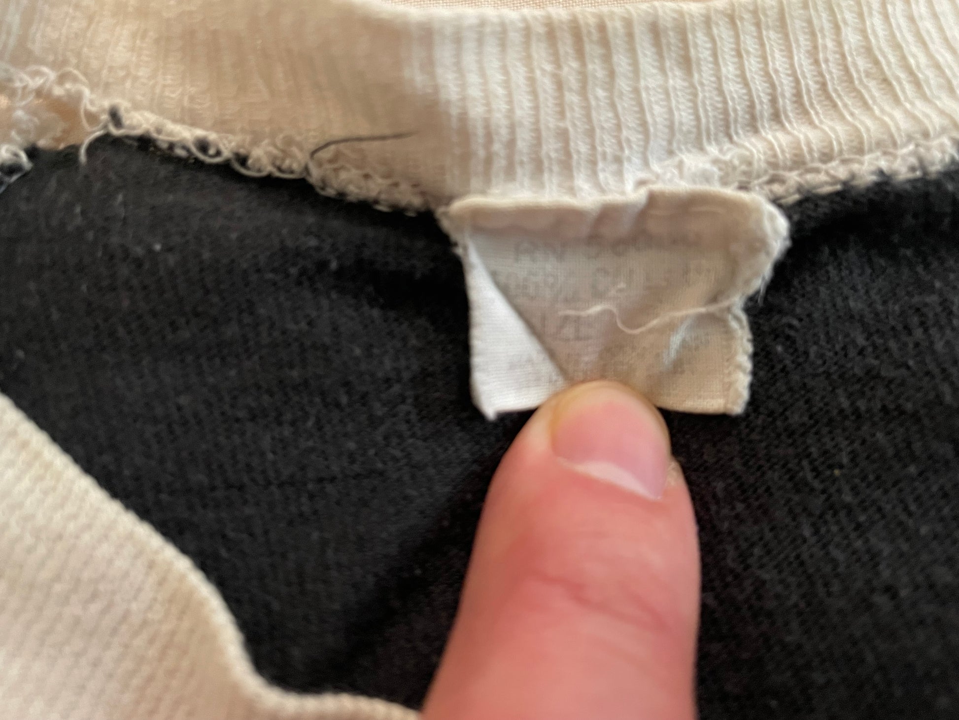 In a used vintage condition. Very thin faded shirt, faded and cracked print. Few small holes around the collar.