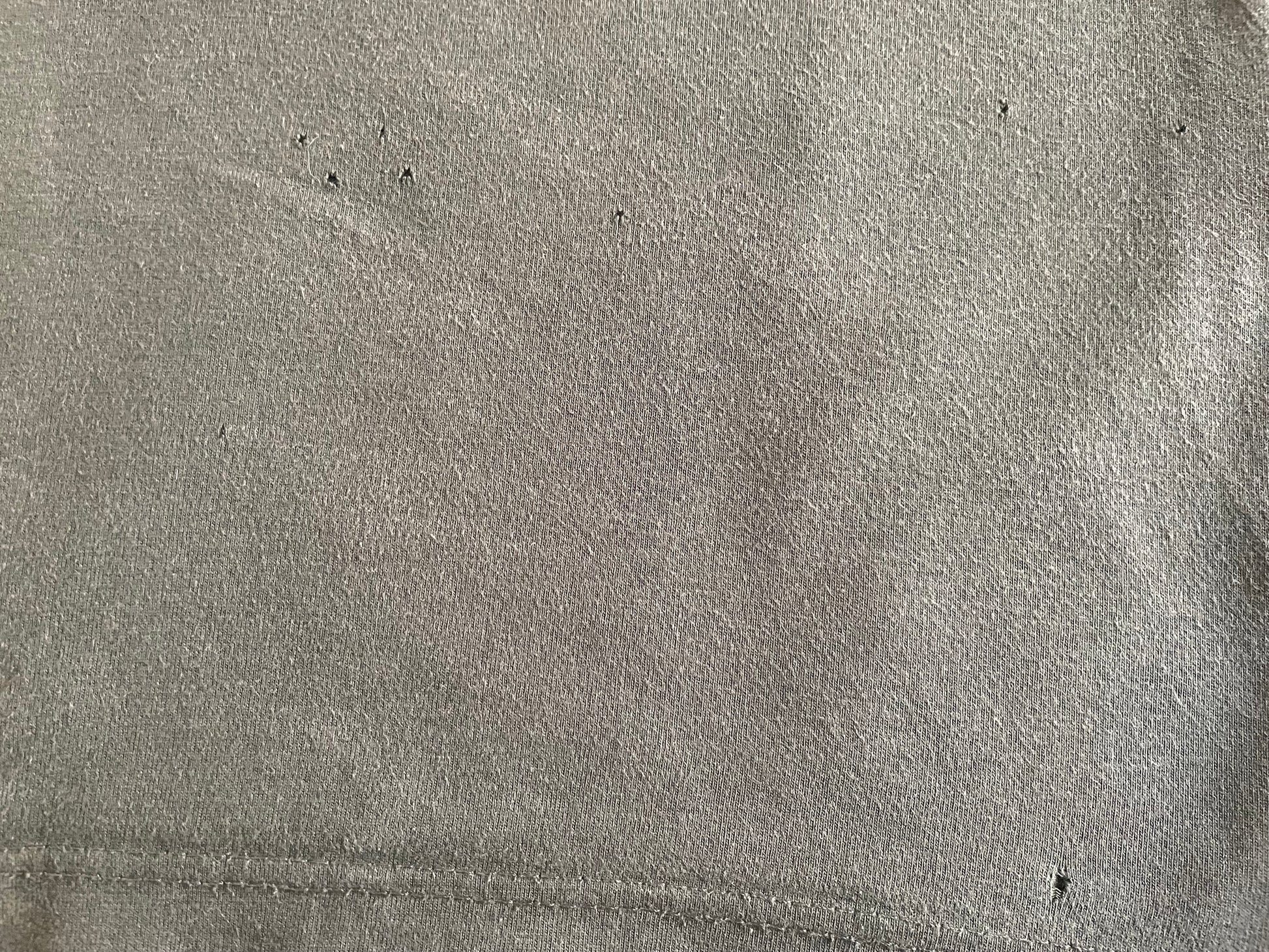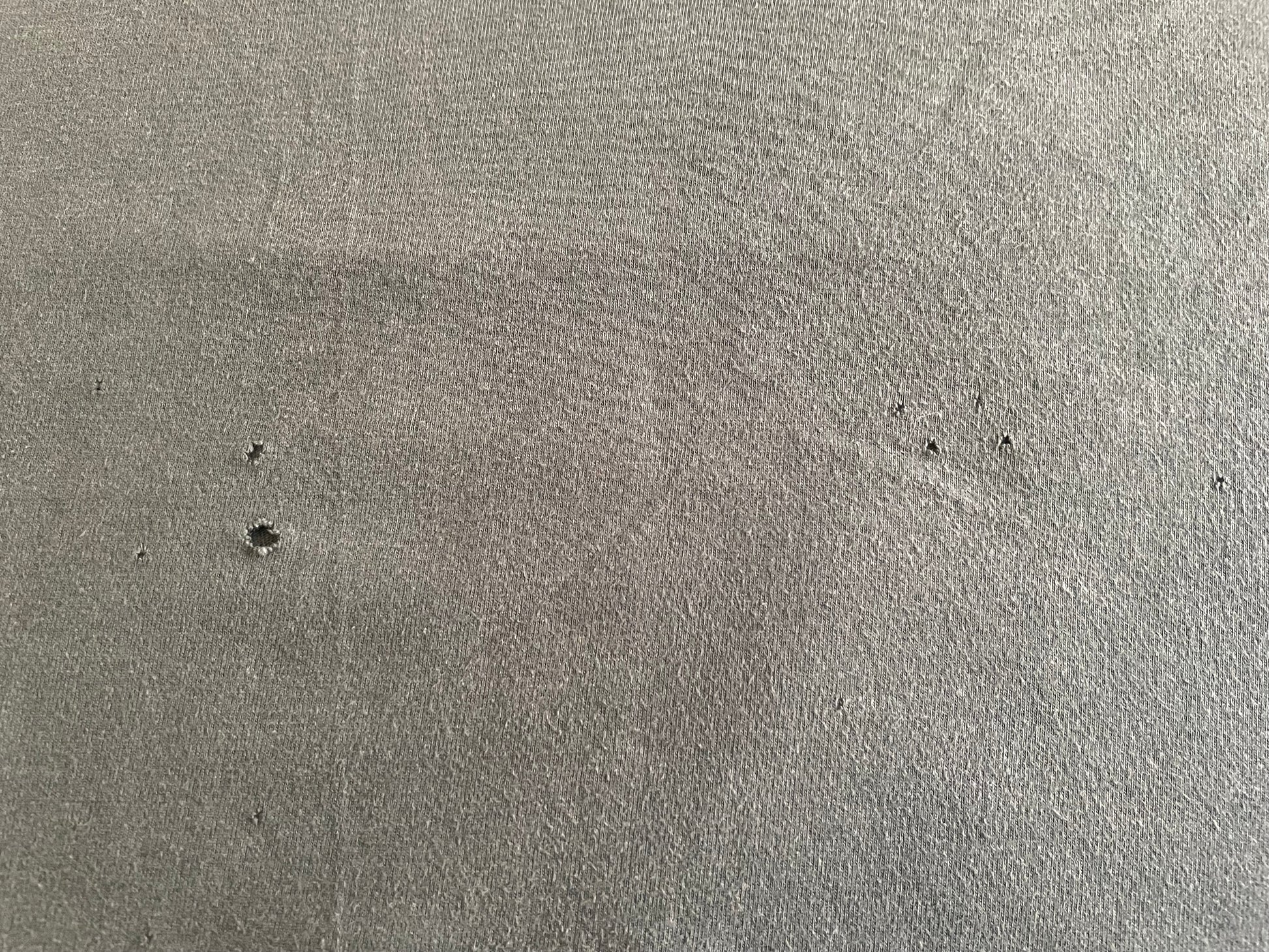 In a used vintage condition. Faded shirt and cracked print. Several holes on the bottom front and back (see pics).
